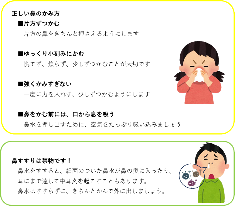 また、正しい鼻のかみ方が重要です。